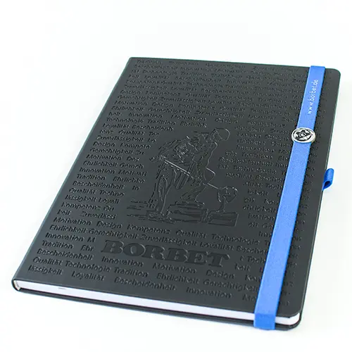 The elegant BORBET Custombook is particularly eye-catching thanks to the embossing of the BORBET foundry and the BORBET maxims. The book is closed with a blue elastic band featuring a stylised A wheel. There is also a blue pen loop on the open side. The inside pages are squared. The BORBET Custombook is delivered in an elegant black gift box.
